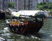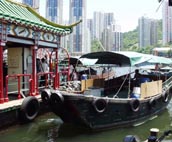 漁船の碇泊風景は壮観である。狭水路の対面の小島側岸沿いには高層住宅ビル群が林立する。アバディーン(香港島)側と