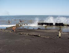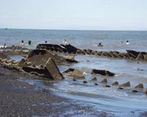 水際には難破して完全に砂に埋もれている船の残骸が横たわる。難破船の鋼鉄製の、完全に