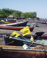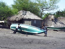 椰子の葉で葺いた舟の置き場。この小漁村のあるチナンデガ県は太陽の照りが肌を刺すほどに