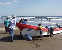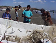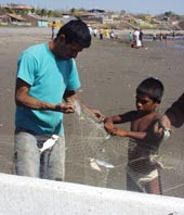 刺し網に引っ掛かった魚を大人顔負けの手際の良さで巧みに網目からはずして、次々と漁労ボートに 投げ込んで行く。そのうちに、ある少年は今日の「分け前」として両手に魚をぶら下げながら誇らしげに家路について 行った。中米の国・ニカラグア北西部の太平洋岸沿いのレオン県エル・ベレーロ(El Velero)という 小漁村にて。時季は乾期の終わり頃に当たる4月。