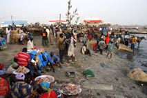 海辺は漁から戻って来たボートで賑わう。ボートの上で漁獲物を魚箱に詰め込む漁夫、ボートから岸辺の魚市場まで陸揚げ