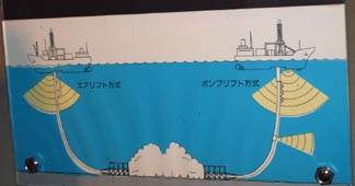 海水とともにマンガン団塊を吸いあげるエアリフト方式と、ポンプで吸いあげるポンプリフト方式の開発が進められて