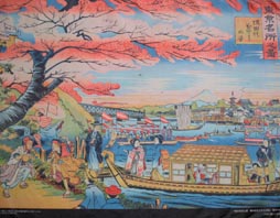 その壁に掛けられたアートのうちの一つである、「隅田川両岸一覧 無縁の日中」という葛飾北斎の絵 (墨田区文化資料