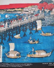 説明書きによると、「中央に描かれる西洋型木場橋の両国橋は、この錦絵が摺られた年に架けられたものである。伝統的な弧を描く橋から