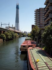 4. 墨田区の北十間川に架かる「枕橋」(Makura-bashi Bridge)から見上げる「東京スカイツリー」。目指す高さは634メートル、