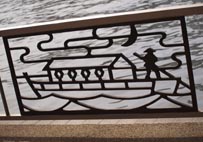 そのテラスを両国橋から蔵前橋へと散策した折にふと見つけたのが、鉄製の欄干に施されたアートである。