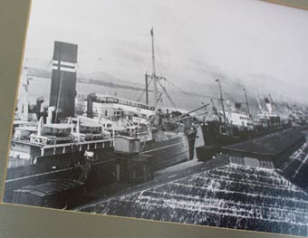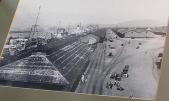 1. サントス港のかつての14番埠頭付近; 画面左最下の停泊中の船は「笠戸丸」か? 不詳である。この写真の額の左下隅には