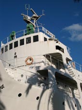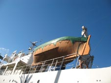 陸(おか)に係留された「東海大学丸II世」。喫水線ならぬ「喫土線」を見せている。