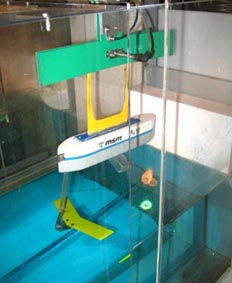 「波で進む船のモデル実験: 飛行機の翼に似た断面をもつヒレに適当な大きさの波があたると、船を進める