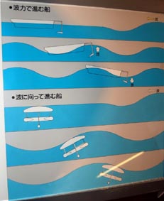 「波で進む船のモデル実験: 飛行機の翼に似た断面をもつヒレに適当な大きさの波があたると、船を進める