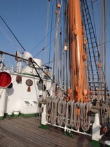 2. 航海船橋後方にメーンマスト、ミズンマストが見える。船橋前方にフォアマストがあるが、画像には写っていない。そのシュラウズ
