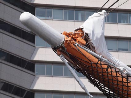 ひろげます。バウスプリット上にひろげた三枚のジブ(三角帆)は、船首を風下に落すのに大切な役割を果たします。