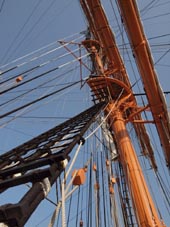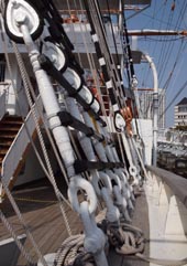 フォアマストの左舷側のシュラウズ(shrouds)。マストを右舷・左舷側からそれぞれに支えている静索を横静索