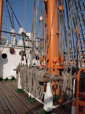 1. ミズンマストの栓座と止索栓(ビレイング・ピン)。栓には動索がコイルアップされ係止されている。 [拡大画像: x22566.jpg]