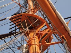 日本丸のフォアマスト、メーンマスト、ミズンマストを見上げると、マストの中間に上下に二つの台(=檣楼)(半月形を