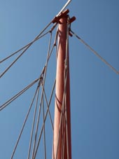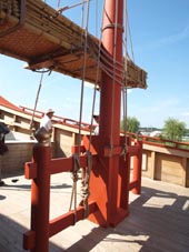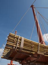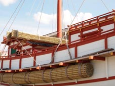4. 前檣と網代帆。網代帆は、竹を薄く削った物を平らに編んで作った網代を竹で縛って繋ぎ合わせたもの。[拡大画像: x22786.jpg]