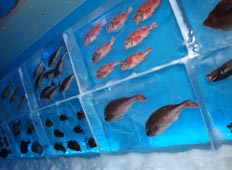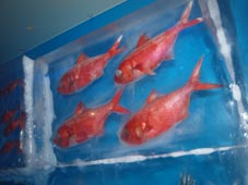 展示されている。独自の製氷技術によって作られた、透明感溢れる氷のブロックの中に閉じ込められた魚たち、