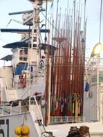 3. 「栄吉丸」の船尾近くにストックされたカツオ一本釣り用の竿。 [拡大画像: x22860.jpg]