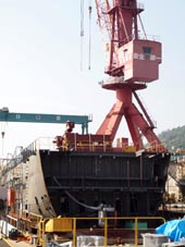 貨物船などの小型船舶の建造実績をもつ (平成22年10月ホームページによる)。画像は、船尾ブロックの接合を残して船体