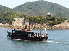 19トン、全長22.3m、定員99人)。いろは丸の後ろの小島「弁天島」の岩壁上に建つのは弁財天(べんざいてん)福寿堂。その後ろには仙酔島