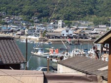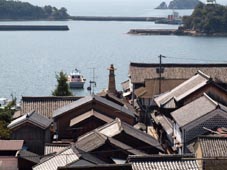 4. 中央に常夜燈が見える。小高いところにある「鞆の浦歴史民族資料館」から市街を見下ろす。まるで江戸時代にタイムスリップ
