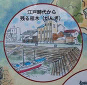 展示されている。画像には写っていないが、展示館の左後方に常夜燈が建つ。階段状の施設は「雁木」(がんぎ)と呼ばれ、船着場の