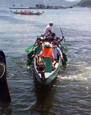 船首(バウ)に座する男性はドラマー (太鼓手) として大太鼓をたたくことになるが、しっかりと聞いていない風である。