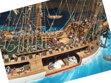 * 船首の主錨近くの小舟はサン・ファン・バウティスタのヨール(雑用小艇)である。船中央寄りにはメキシコ側の武装した 大型ランチがあるが、画像には写っていない。