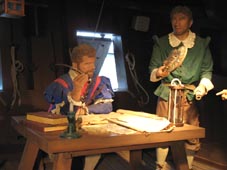 3. サン・ファン・バウティスタ船尾楼内のジオラマ。航海士らがトラバスボードを見ながら船の航跡を確認し、船位を推定