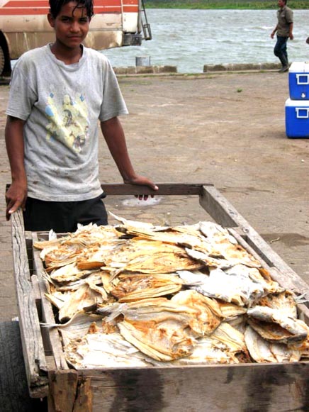 サン・カルロス港での桟橋風景/魚の干物を運搬する少年
