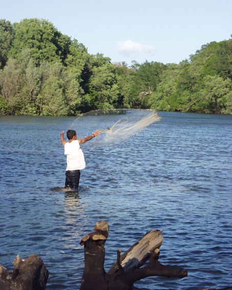 入り江で投網に興ずる若者