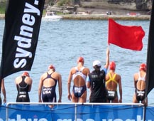 4. 「Elite Women」レースにおけるスイムのスタート直前の瞬間。トライアスリートは笛の合図とともに海中へジャンプ、