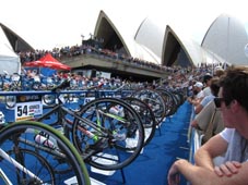 1. オペラハウス傍に設営されたスイム・スタート用の特設ステージ兼トランジショナルエリアが画像中央部の下方に