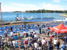 3. 海側にスイムのスタートを切るフローティング・ステージが設営されている。手前のトランジショナルエリアには