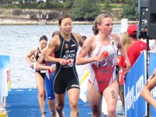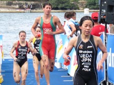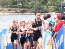 5. 崎本選手(先頭走者。スイムを終えてトランジショナルエリアに向かうところ)。 [拡大画像: x23490.jpg]