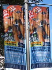 0. ハイドパークを東西に貫通する「パーク・ストリート」沿いで見かけた、トライアスロン競技大会の開催を知らせる幟。