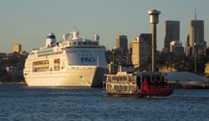 楽しもうというツーリストたちを乗せて、これからシドニー・ハーバー・ナイト・クルージングに向かうところである。