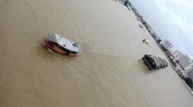 タイの首都バンコク、チャオプラヤ川での風景。陸上施設に例えれば、水深4、5メートルの巨大な水泳プールが