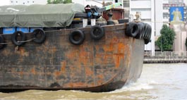 1. 小船に曳かれた「5連結バージのはしけ」がゆっくりと遡上する。 [拡大画像: x23868.jpg]