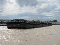 運搬しているらしく、バージの吃水線はかなり深めである。川の流れもそこそこあるので、曳き船はバージを強引に引っ張らず、