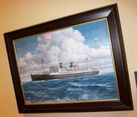 説明パネルには、「サンフランシスコ航路上の「浅間丸」を描いた作品。昭和4年(1929)に日本郵船の貨客船として竣工した「浅間丸」は、
