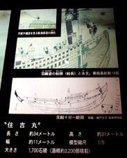 「住吉丸」: 長さ 約34m、高さ 約31m、幅 約11m、模型縮尺 1/5、大きさ 1,700石積(酒樽約3,200個積載)。 [拡大画像: x23777.jpg]