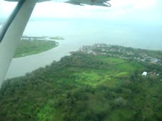 3. ニカラグア湖とサン・ファン川。集落が見える辺りがサン・カルロスの中心街である。天気が良ければソレンティナメ群島を湖上