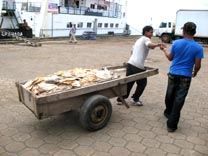 埠頭では、少年が、ボートから陸揚げされた魚の乾物を山積みにした荷車を引いて行く。下流に向うボートには、炭酸飲料、