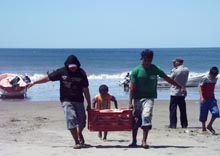 海から浜へ引き揚げる。漁師仲間や子供らが漁から戻って来たボートを取り囲み、漁獲された魚をプラスティック製魚箱に取り込む。