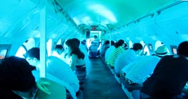 2. 艦内の風景。両舷の円形観察窓から海中世界を興味津々に覗き込む艦客。 [拡大画像: x24506.jpg]