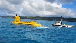 南洋の楽園・サイパン島。波に揺れるはしけ船からイエローボディの観光潜水艦「ディープスター Deepstar」に跳び移る。