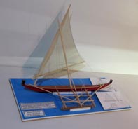 flying proa」とも称される) の模型である。片舷のみに張り出す外舷浮材 (single outrigger) と、ラティーン・セール