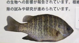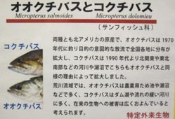 展示解説パネルによれば、ともに北米原産でサンフィッシュ科である。オオクチバスは、1970年代に釣りを目的とした意図的な放流で