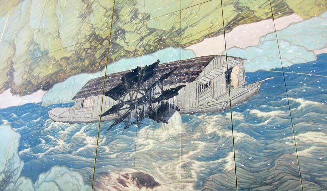2. 船に水車小屋(製粉所)が乗せられている。船小屋の左横には水輪(すいりん)(水車部分)が取り付けられていたが、